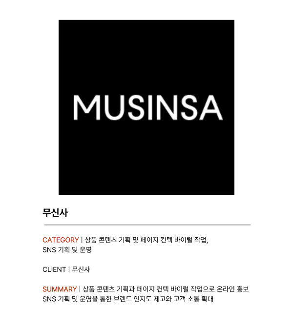 Portfolio 포트폴리오 제목 [패션] 무신사 브랜드 SNS 운영 목록 - 무신사 뷰티, 무신사 키즈, 무신사 명품 등 콘텐츠 기획- 신규 캠페인 진행 시 인기페이지 컨택 및 바이럴 작업- 평균 누적 조회수 30만, 최다 1000만 조회수 달성 이전글 [교육] 충북대학교 브랜드 SNS 운영 다음글 [푸드] 사조대림 브랜드 SNS 운영
